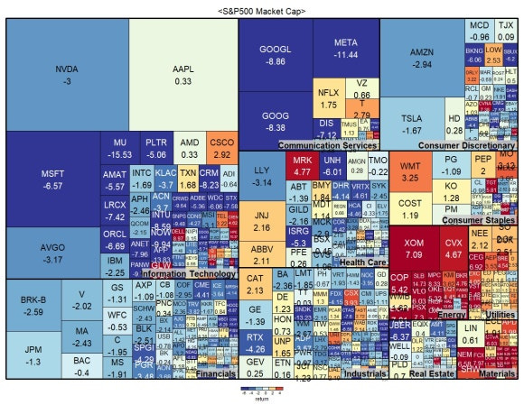 안녕하세요 1530입니다. S&P500 에 대해 주간 시가총액, 거래량, 거래대금, 등락률상위, 등락률하위 종목들에 대해 살펴보도록 하겠습니다.